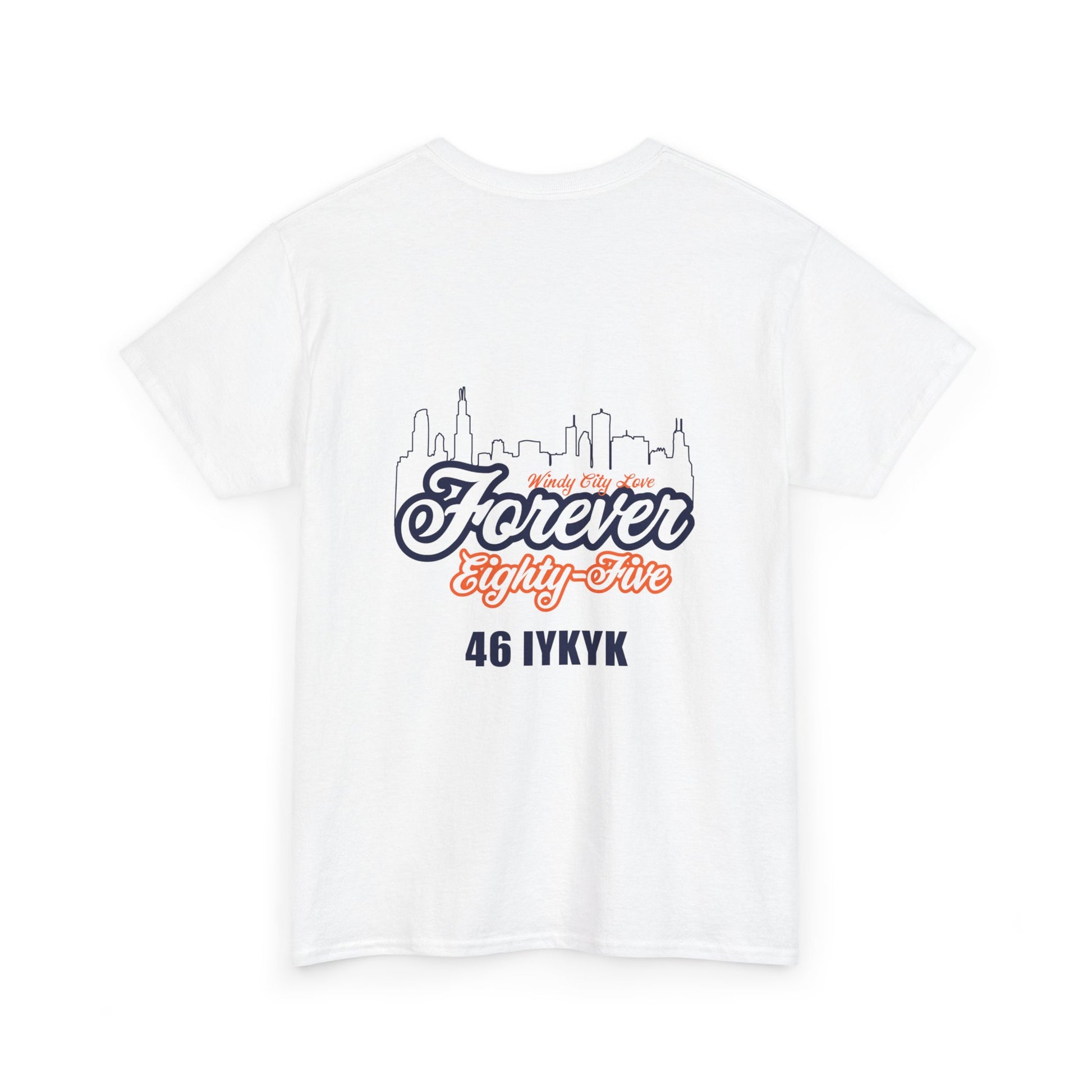 A small chest emblem keeps the front clean and understated. On the back, a detailed city skyline is layered with Forever Eighty Five script and a subtle numeric mark. The 46 IVYKYK detail is placed with intention, serving as a reference that feels familiar to those who understand it without needing explanation.